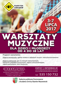Zapraszamy do bezpłatnego uczestnictwa w pięciodniowych warsztatach muzycznych dla dzieci i młodzieży mieszkających na terenie gm. Ożarów Mazowiecki.
